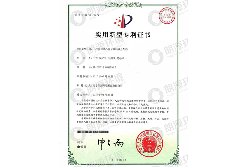 高速離心霧化器 專利證書(shū)